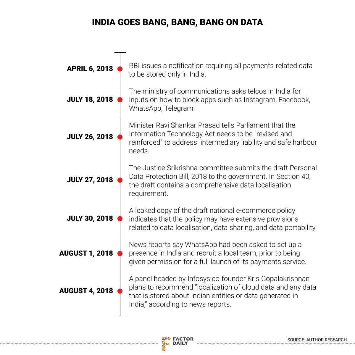 August 4: A report emerged that a panel headed by Infosys co-founder Kris Gopalakrishnan and tasked with framing a cloud policy, was planning to recommend “localisation of cloud data and any data that is stored about Indian entities or data generated in India”. It reportedly goes on to say that this data “must be available for investigative agencies and national security agencies” and “Indian legal and policy frameworks must focus on ensuring that data generated from India can be utilised for the benefit of Indian citizens, governments and private players”.
