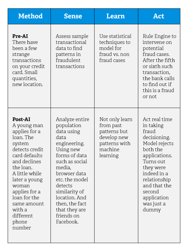 Akshay Mehrotra, CEO of Early Salary, a company that provides loans to young employees through a machine learning-based lending model, explains the post-AI scenario in fraud: given that fraud is a rare occurrence, the sample data may not be enough to learn from. More importantly, the methods of fraud could keep changing. In such a situation, AI becomes a big change in the way we can assess problems and take more real time decisions in tackling fraud. And the skill sets needed to develop this are not just superior data engineering skills but a deep understanding of human behaviour that could be modelled through alternative data.