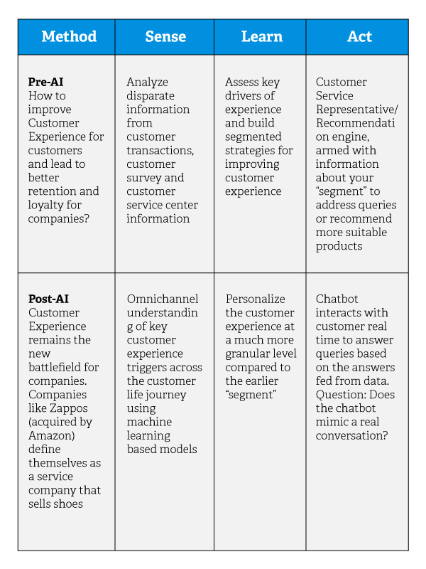 According to Prithvijit Roy, CEO of BRIDGEi2i Analytics Solutions, a data science firm, AI represents a three-step process and each step lends itself to a different skill-set. “I see the process of AI as a way of helping machines (artificial) sense the data around them to learn from it (intelligence) to drive actions,” he says. “It’s changing the way we sense, learn, act.”