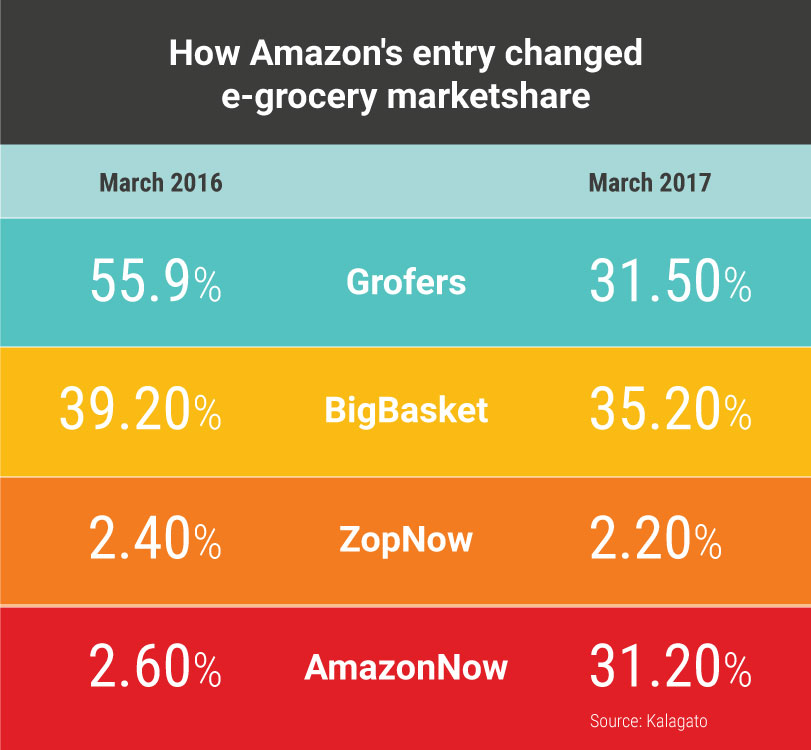 That can be scary for Amazon’s competitors. “Investors are scared that Amazon can start a price war, but grocery is not a money game,” says Rahul Hari, CEO and founder of Gurgaon-based Satvacart. “In the US, Amazon has been operating since 2006, but still only 2% of the grocery business has gone online.”
