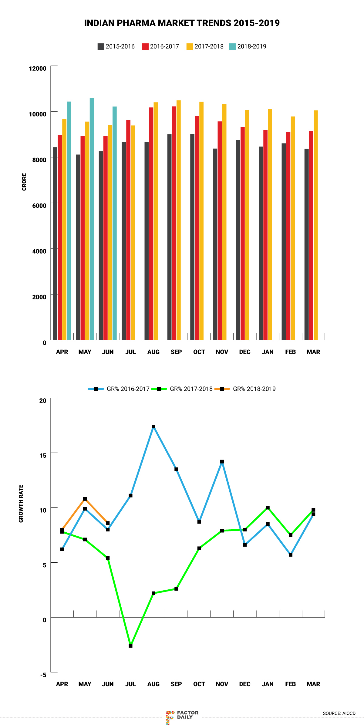 Drugs worth Rs 10,215 crore (about $1.49 billion) were sold in India in the month of June 2018, according to data from The All India Organisation of Chemists and Druggists (AIOCD). That’s a growth of 8.6% from the same month last year. About Rs 119,641 crore (about $ 17.5 billion) worth of drugs were sold in India in 2017 and that’s expected to grow to $55 billion by 2020.