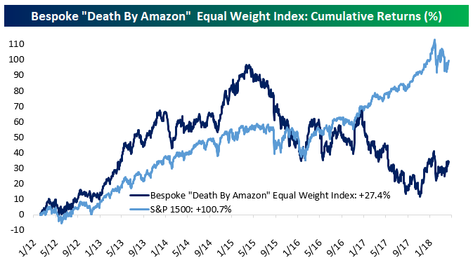 But over the years, the US market has rewarded Amazon for making outsized bets even as it punished competitors — captured by the “Death by Amazon” index of stocks exposed to Amazon.