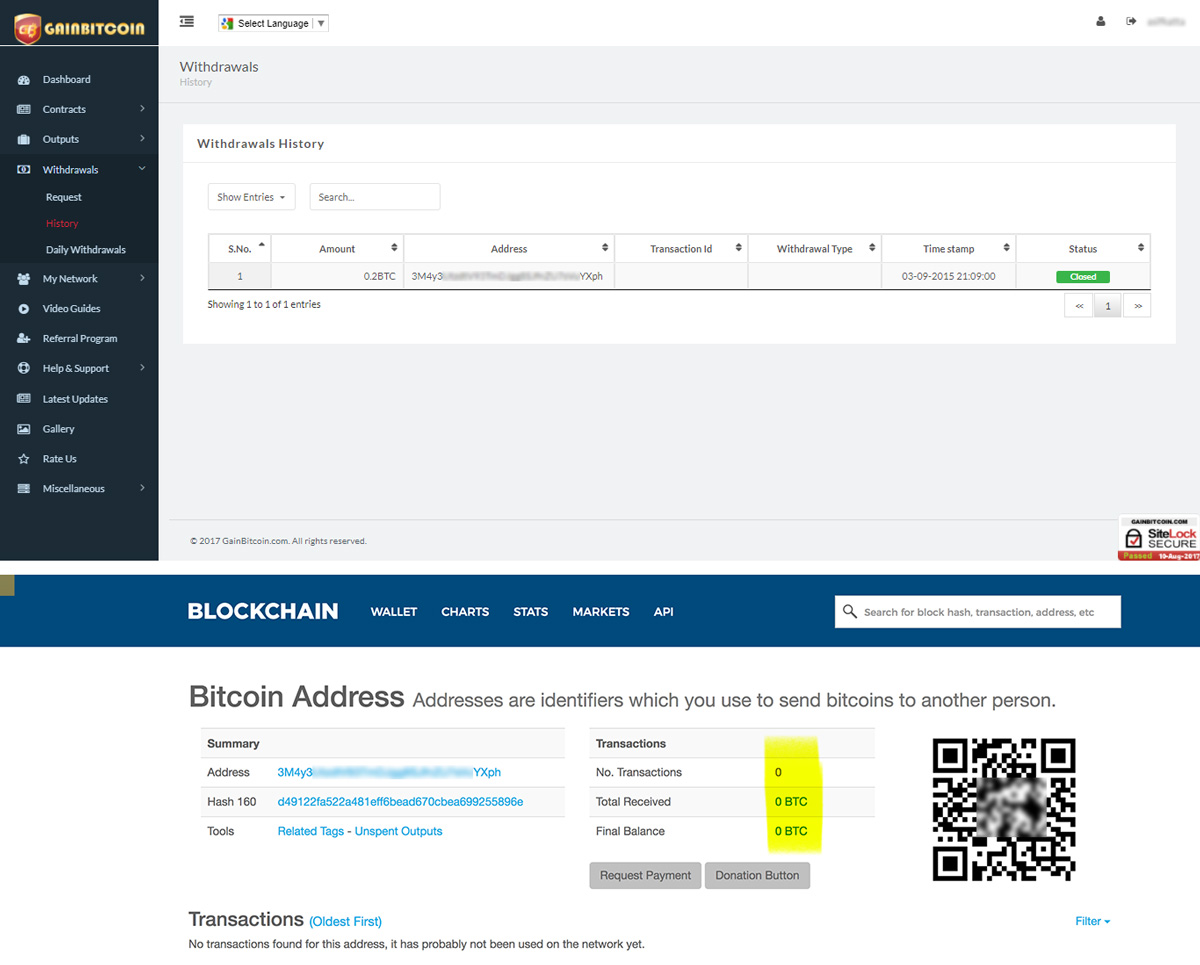 Sometime in August 2015, Suresh tried making some withdrawals from his GainBitcoin income into his private wallet but was unable to do as the service was down for maintenance. “Later we tried again on September 3rd, to withdraw around 0.2 Bitcoins from the top account and provided a Blockchain.info wallet details for it and even after a couple of days the transfer did not happen and the status was shown as pending,” adds Suresh.