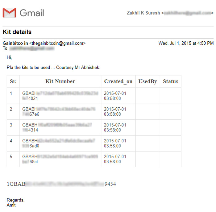“We paid Rs 98,000 via two bank transactions to Abhishek Bhandari under whom we had registered. And being an MLM scheme we make direct payment to our upline and not directly to the company. The payment to GainBitcoin was to be made in Bitcoins and Abhishek transferred six BTC on our behalf to GainBitcoin with the money we paid him. After this, we received activation kits for six contracts worth 1 BTC each via email from GainBitcoin,” says Suresh.