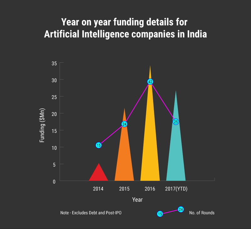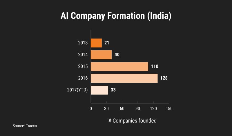 In sharp contrast, Indian startups have collectively raised less than $100 million from (2014-2017YTD), according to data from startup analytics firm Tracxn — that’s smaller than Andrew Ng’s recently launched $150 million VC fund. Another way to look at it: Grammarly, a Valley-based spell check tool raised more dollars than all of India’s AI startups put together in the past three and a half years.