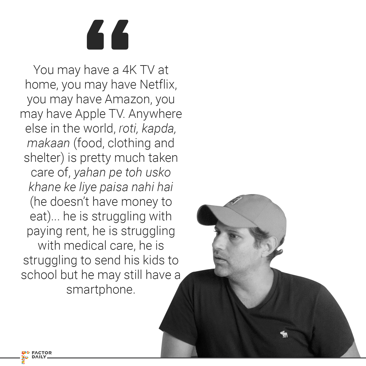 The phone for us is a tool. You may have a 4K TV at home, you may have Netflix, you may have Amazon, you may have Apple TV. Anywhere else in the world, roti, kapda, makaan (food, clothing and shelter) is pretty much taken care of, yahan pe toh usko khane ke liye paisa nahi hai (he doesn’t have money to eat)… he is struggling with paying rent, he is struggling with medical care, he is struggling to send his kids to school but he may still have a smartphone. That’s a very different rationale and reason why he has it. So it’s very important to understand the nuance of that Indian consumer and who and what do you mean to him in his life and only then can you make a difference and unless you cannot make a difference and add value to his life, you have no reason to be in business. If it’s only for profits, then toh koi fayda hee nahi hai (then it’s of no use).