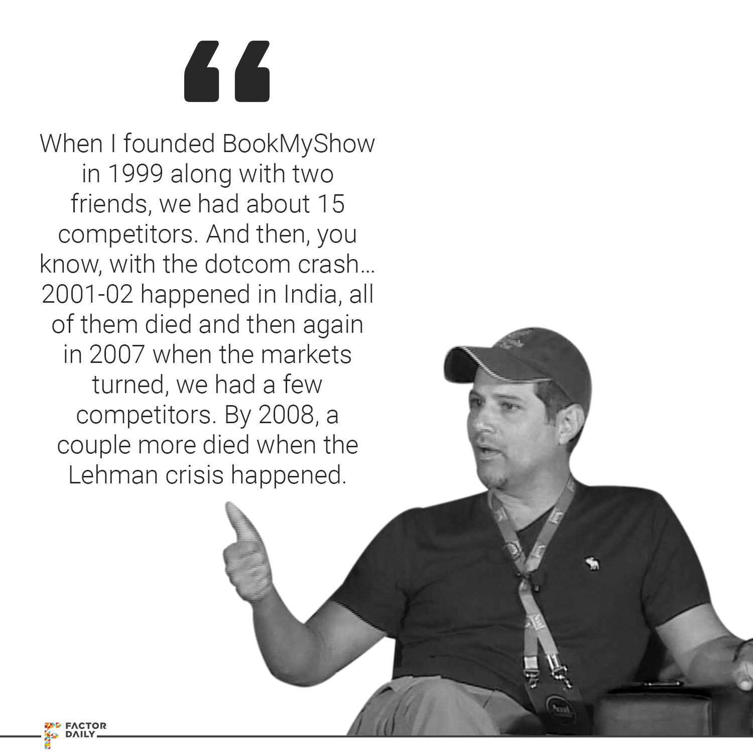 Ashish: So we’d been around for 18 years. Look, when I founded BookMyShow in 1999 along with two friends, we had about 15 competitors, not very many people. And then, you know, with the dotcom crash… 2001-02 happened in India, all of them died and then again in 2007 when the markets turned, we had a few competitors. By 2008, a couple more died when the Lehman crisis happened and then again when this whole gold rush which is the internet boom, this artificial boom, crazy amount of investing and few ideas and people were going cuckoo in 2012…13…14, again we had some crazy number of companies.