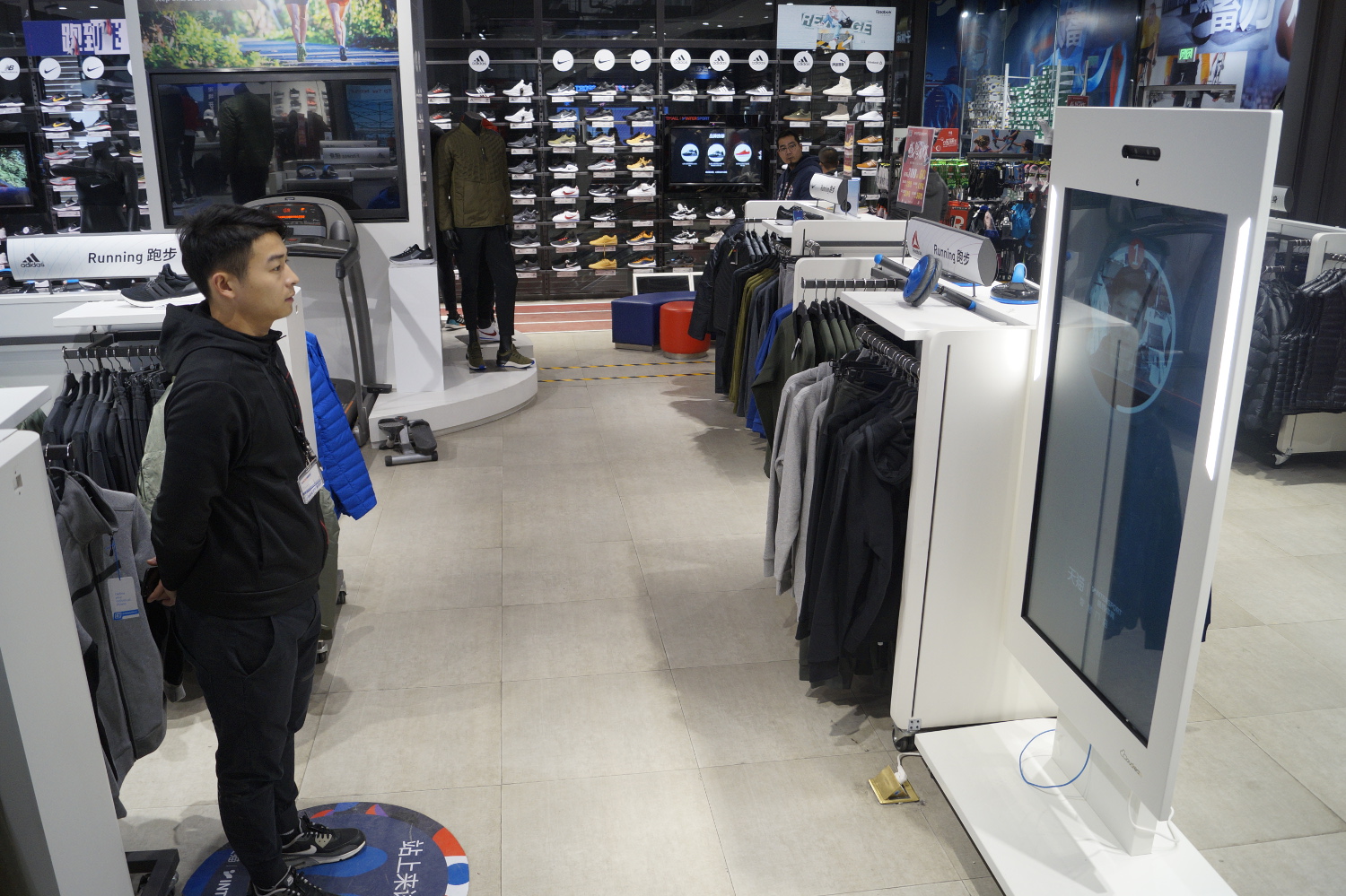 At the Intersport X Tmall store in Qianmen, store manager Jerry shows off the AI-powered trial station.