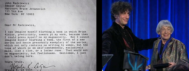 Left: The letter that Ursula K. Le Guin wrote to Harcourt refusing to bulb an all-male sci-fi anthology. Right: Le Guin receiving from Neil Gaiman the Medal for Distinguished Contribution to American Letters at the National Book Awards 2014