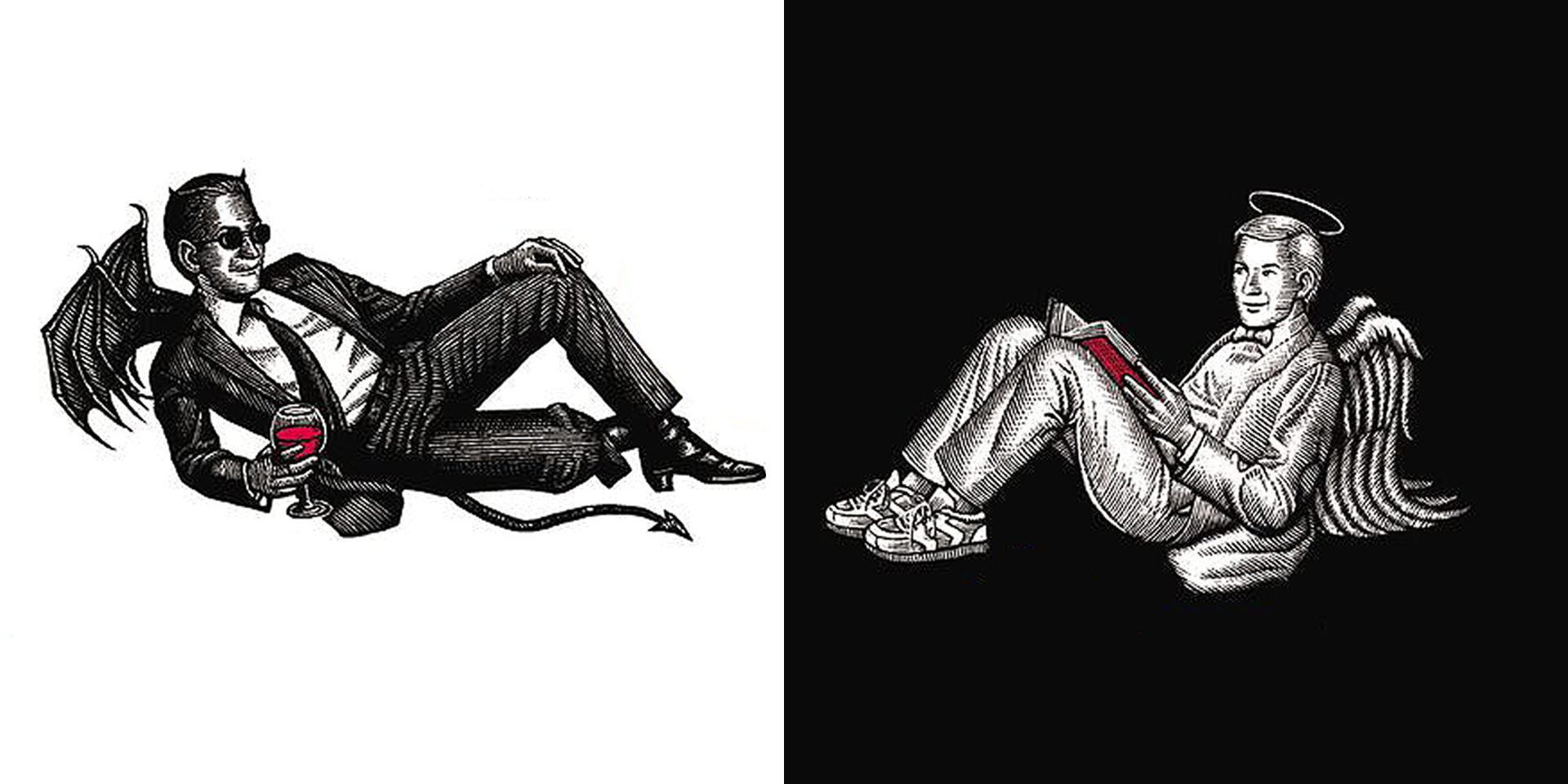Lead image: Illustrations from the 2006 HarperCollins hardcover editions of Good Omens which had two different black & white dust jackets: one listed Neil Gaiman's name first (with the image portraying the “demon” Crowley), while the other had Terry Pratchett's name first (with the “angel” Aziraphale on the cover).