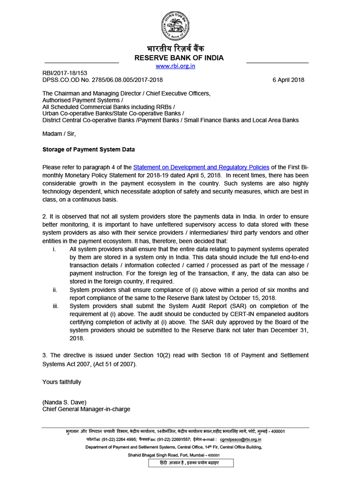 At the core of this debate is the motivation behind the RBI’s move. The text of the notification states that “to ensure better monitoring, it is important to have unfettered supervisory access to data stored with these system providers”. It is unclear, though, why this need cannot be met by requiring them to store a copy in India, as opposed to effectively prohibiting them from moving this data out of India. This lack of clarity has already resulted in the finance ministry pushing back against the RBI with exactly such a suggestion.