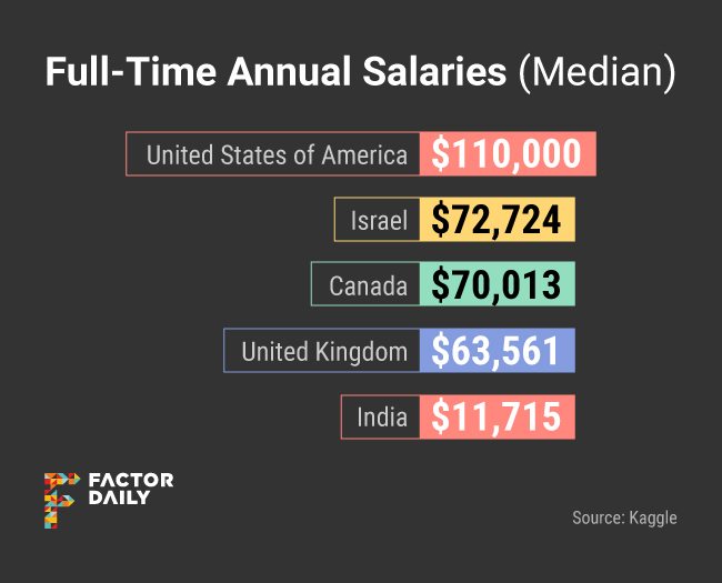 Data scientists and machine learning engineers in India make about one-tenth of what their counterparts in the United States do, a leading global survey shows.