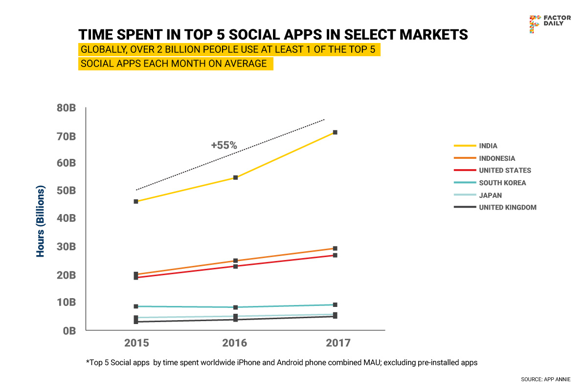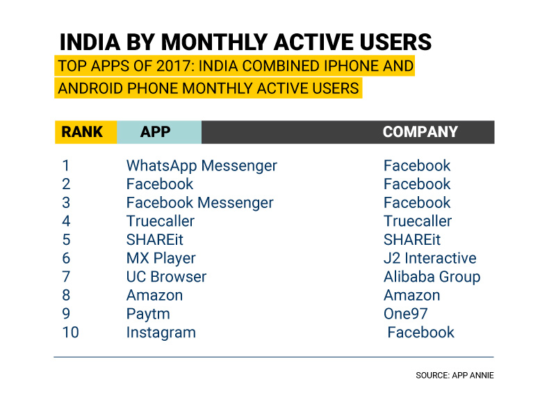 WhatsApp has over 200 million users in the country and is by far the most popular messaging app in India. According to App Annie’s report published this week, in India, over 71 billion hours were spent in the top 5 Social apps in 2017, with WhatsApp accounting for over 50% of those hours.