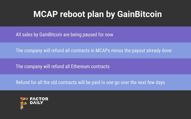 With the latest move, the second such pivot in a span of three months, which some investors feel is an eyewash to cover up,unpaid dues to them, all existing contracts with GainBitcoin will be terminated after investors are paid the remaining amounts in one shot as MCAP tokens over one week.