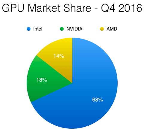 Intel swept up the market share (68% market share Q4 2016) while NVIDIA(17.5% market share) and AMD(14.4% market share) commanded a premium to become the de-facto gaming chip makers for serious gaming.