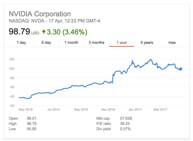 NVIDIA is riding the rising tide of A.I and machine learning. Over the last 12 months, it’s market cap has increased by more than 2.5 times from a tad over $20 billion to more than $56 billion today.