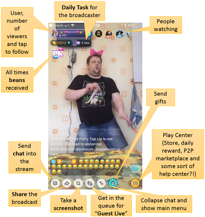 • Chat: There is a constant chat stream running through every broadcast. The broadcaster will often call out the names of viewers who send premium gifts (which add to the total Beans tally). This too feels good as a viewer