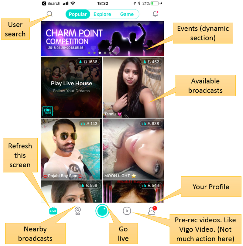 For a registered and logged-in user, their app opens up into this screen. Here the user can check out the most popular ongoing broadcasts. This has a bunch of faces, which are essentially the profile pics of the broadcasters. This allows them to, for instance, put a highly clickworthy pic.