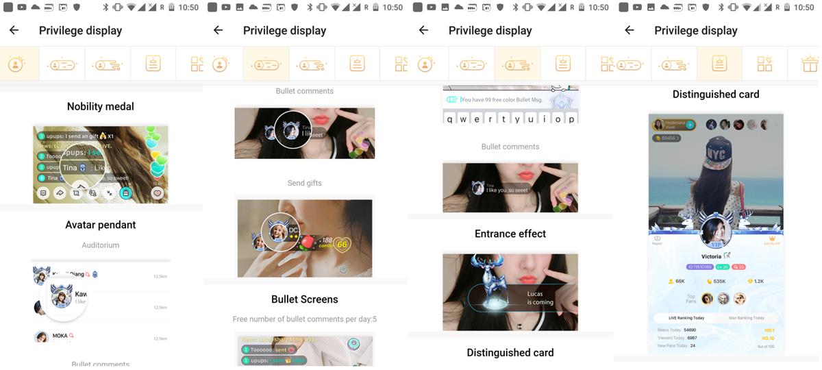VIP status comes in 3 tiers, each giving a higher value than the former. VIP status is a sure shot way to get noticed within the complicated, crowded world of Bigo. There are cosmetic effects (screenshot below) and there are also other benefits. VIP’s gets gifts on renewals and are able to send a standout chat messages.