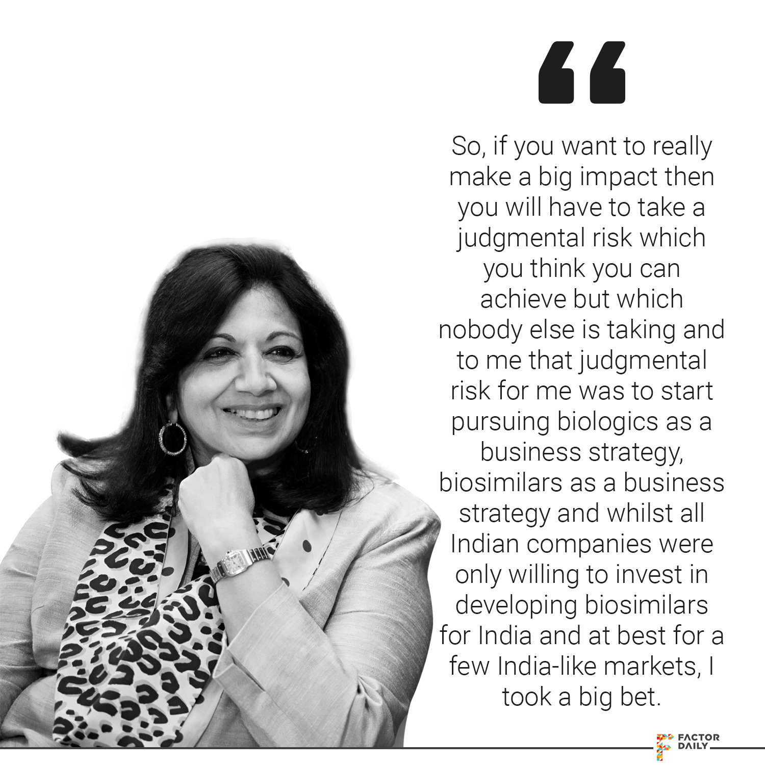 Kiran: When I got into this business, as you know, as an entrepreneur I always believed that you must differentiate yourself as an entrepreneur. You must do something which is out of the ordinary, don’t just be a clone of the others. If you want to stand out, you have to take a risk and a differentiated risk that others are not taking and, to me, that is what an entrepreneurial journey should be all about. So, if you want to really make a big impact then you will have to take a judgmental risk which you think you can achieve but which nobody else is taking and to me that judgmental risk for me was to start pursuing biologics as a business strategy, biosimilars as a business strategy and whilst all Indian companies were only willing to invest in developing biosimilars for India and at best for a few India-like markets, I took a big bet.