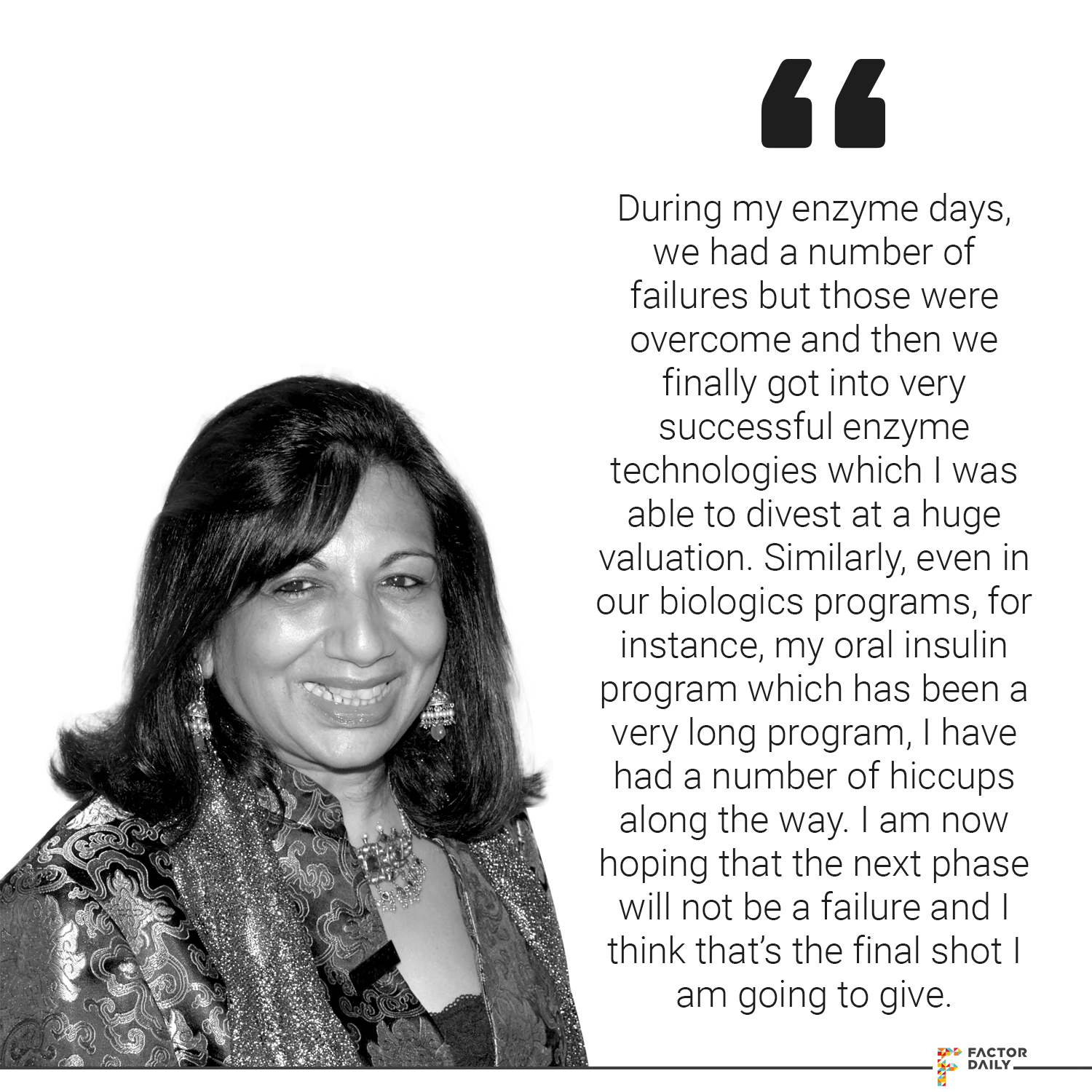 Kiran: I will give you an example. I mean very recently, even less than a year ago, people told me that I am wasting shareholders’ money, investing in a very, very expensive and risky program. I was told, why can’t I be like the rest of the pharma companies and take, you know, sort of better, calculated risks, lower risks? Why are you taking such big risks? Why are you investing so much money and you are really not doing a great job? And some of them are very, very fierce critics, even being very personal about my gender, it was that bad and you can imagine how angry I was. And I would try to counter it on social media. This I am talking about social media but I have also had this in person, you know when investor meetings have told me that, I am being too much of a risk taker, they would like me to slightly subdue my risk-taking in terms of the business. But I think, even on social media I kept sort of fighting back, saying, ‘Look, I am an entrepreneur who bets big. I am an entrepreneur who wants to take risks and I personally believe I am taking a judgmental risk which I am confident of taking and overcoming.’ And I have also sort of tried to reason with people, ‘Look, failure is inherent to our businesses and I said, ‘For those of who don’t want to take these kinds of risks which you are perceiving, please don’t invest in our company.’