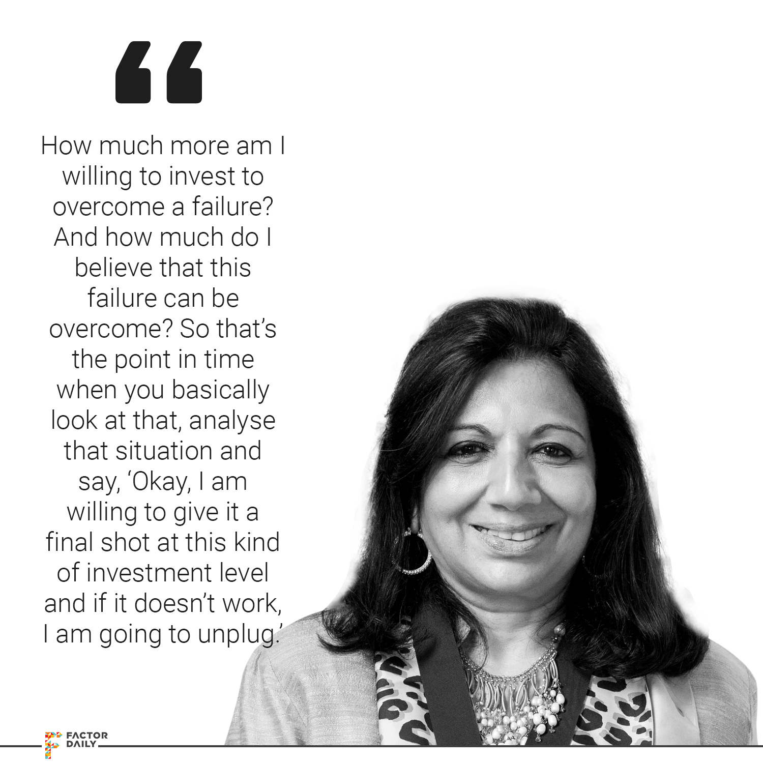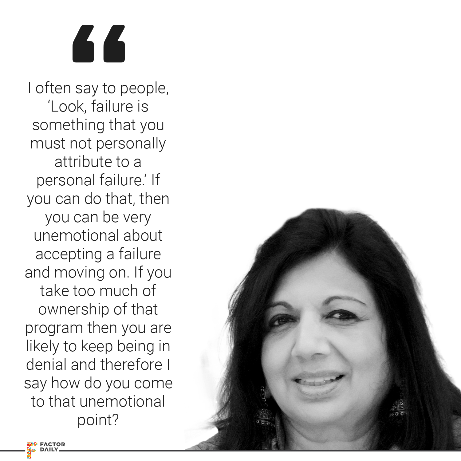 Kiran: No, it’s a very good question. I think I often say to people, ‘Look, failure is something that you must not personally attribute to a personal failure.’ If you can do that, then you can be very unemotional about accepting failure and moving on. If you take too much of ownership of that program then you are likely to keep being in denial and therefore I say how do you come to that unemotional point? Because I think that unemotional point comes when you try a few times and it doesn’t succeed and then finally you basically analyse that failure, saying, ‘Why am I failing?’ I think that analyses is very important and that you must do very unemotionally.