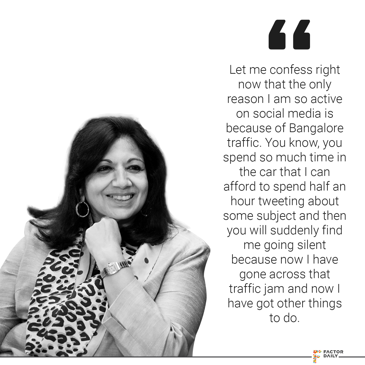 Kiran: So, I think I am a person who has varied interests but I also know how to prioritise my time. I do believe that there are certain interests, you know, when you are in a position of influence and when you do have interests and I think every one of these interests is a vested interest because ultimately it’s compelling self-interest in many ways. I want this country to be a better country for all, I want my city to be a good city for people who live in this city, I want India to portray a certain image and, of course, I do realise that there are a lot of inequities in society, in the country that we live in, in the world we live in… and I feel, as a voice of influence, I need to do something so that I can actually speak up and I feel that if I can make a difference, if I can bring about change, well, that would be something that I could possibly do for the benefit of others. I do prioritise my time, although I am very active on social media, let me confess right now that the only reason I am so active on social media is because of Bangalore traffic. You know, you spend so much time in the car that I can afford to spend half an hour tweeting about some subject and then you will suddenly find me going silent because now I have gone across that traffic jam and now I have got other things to do. So you know, I spend a lot of that kind of time trying to be active on social media but then the moment I am at work, I am off social media. So that’s my confession.