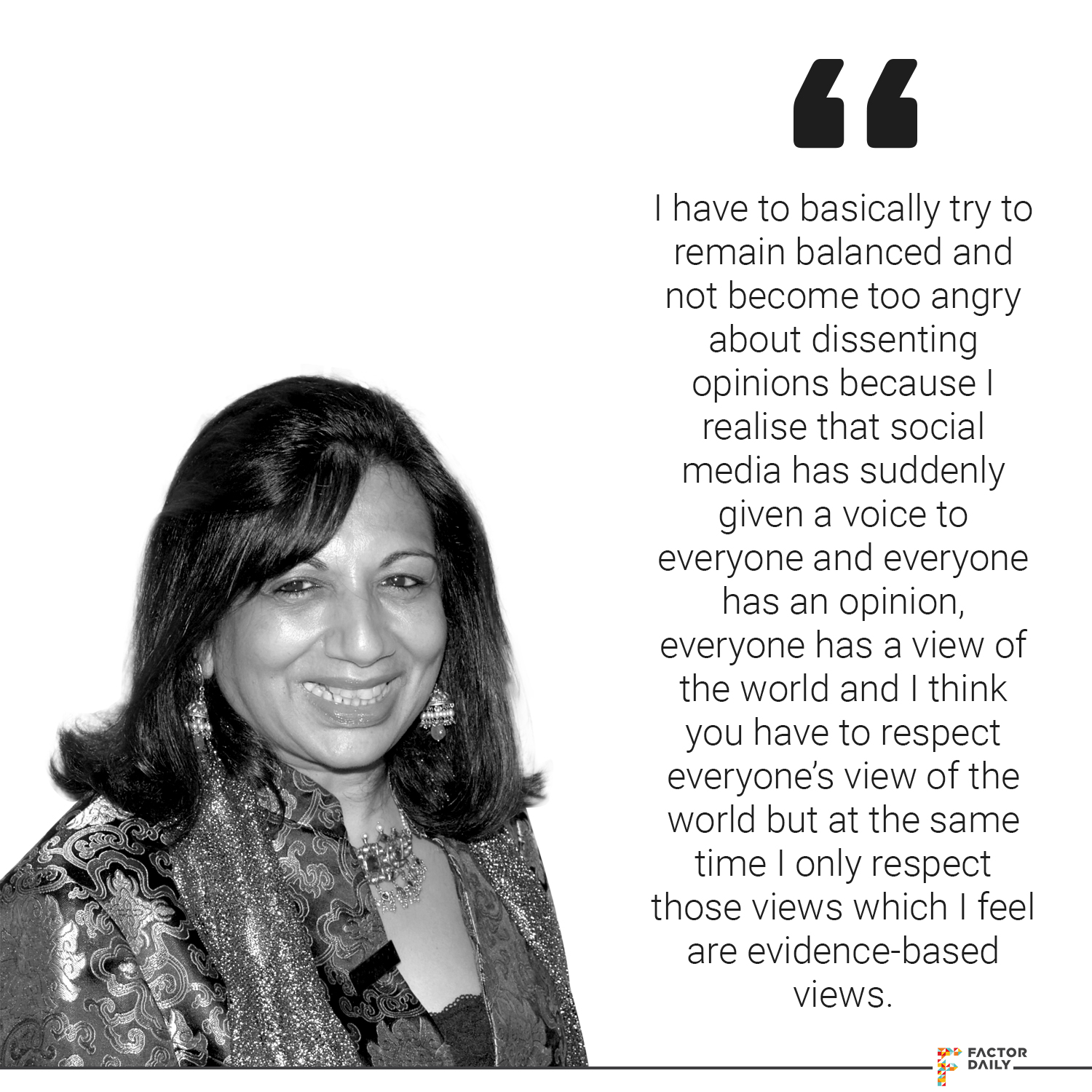Kiran: You know it’s very difficult to answer that question because I think people don’t rely on data or evidence which is what I like to rely on. I think that the only balance that you can strike is if you can reason with data, if you reason with evidence, you can reason with clear not anecdotal but substantiated data. That’s not happening today. It’s opinionated discussions that we have, it’s not evidence-based data, I mean discussions. It’s very difficult to do that. I have to basically try to remain balanced and not become too angry about dissenting opinions because I realise that social media has suddenly given a voice to everyone and everyone has an opinion, everyone has a view of the world and I think you have to respect everyone’s view of the world but at the same time I only respect those views which I feel are evidence-based views.