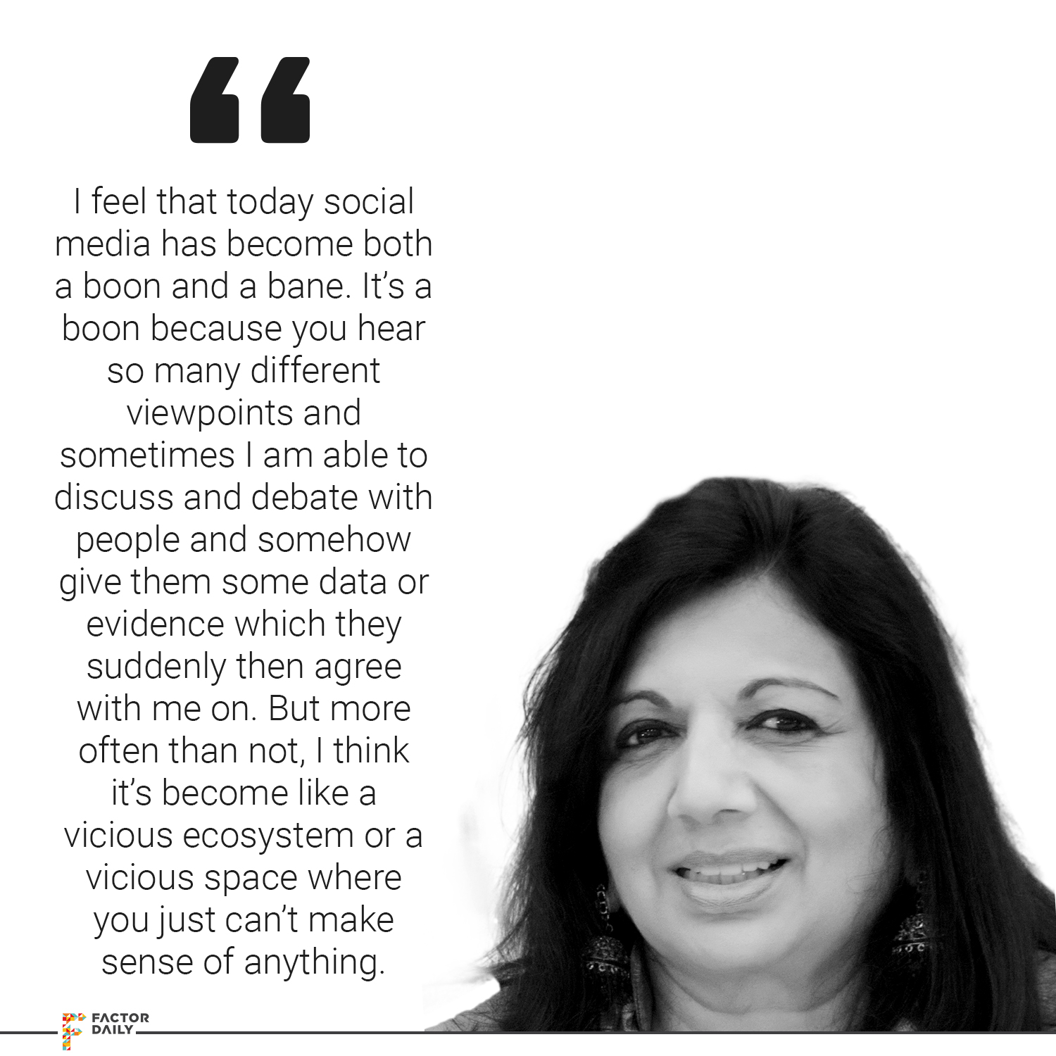 I just feel that today social media has become both a boon and a bane. It’s a boon because you hear so many different viewpoints and sometimes I am able to discuss and debate with people and somehow give them some data or evidence which they suddenly then agree with me on. But more often than not, I think it’s become like a vicious ecosystem or a vicious space where you just can’t make sense of anything. That is dangerous because, you know, you can immediately sort of veer thinking or a thought process into a different direction which can become very dangerous.