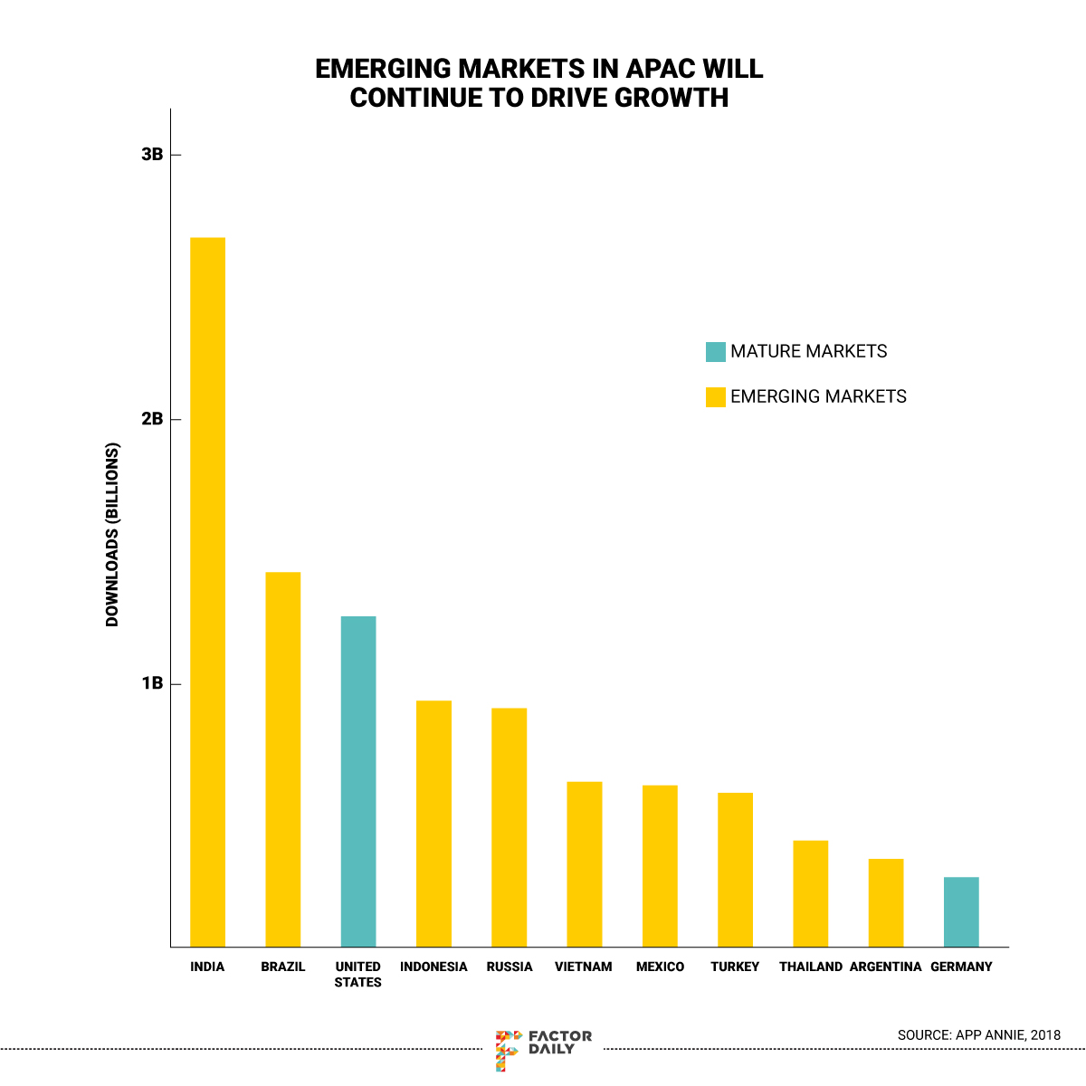 In emerging markets, India is the largest in terms of downloads. Over 2.8 billion game downloads were carried out during the first half of 2018, as per a report from App Annie. That’s nearly double that of Brazil, the next big emerging market.