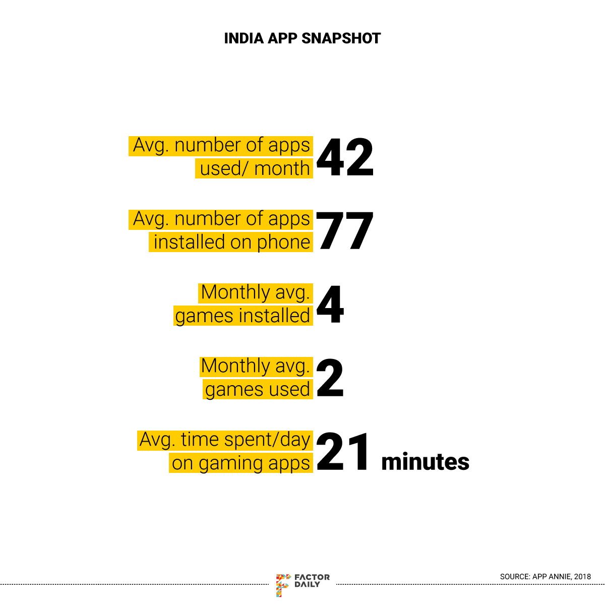 Indian consumers, as per the App Annie report, have about 77 apps on their phones on an average and they end up using 42 of them in a month. Indians spent upwards of 20 minutes on games every day in the first half of 2018.