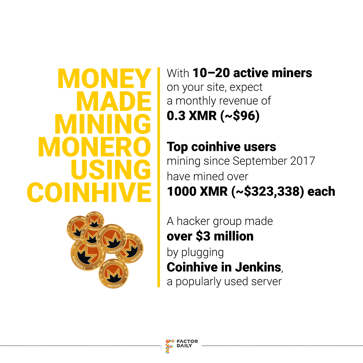 With just 10-20 active miners on your site, you can expect a monthly revenue of about 0.3 XMR (~$96), Coinhive explains on its website. Top Coinhive users who have been at it since the start (September 2017) have mined over 1000 XMR (~$323,338) each, said the email from Coinhive. Then there’s also the likelihood of Monero, like Bitcoin, appreciating over time.