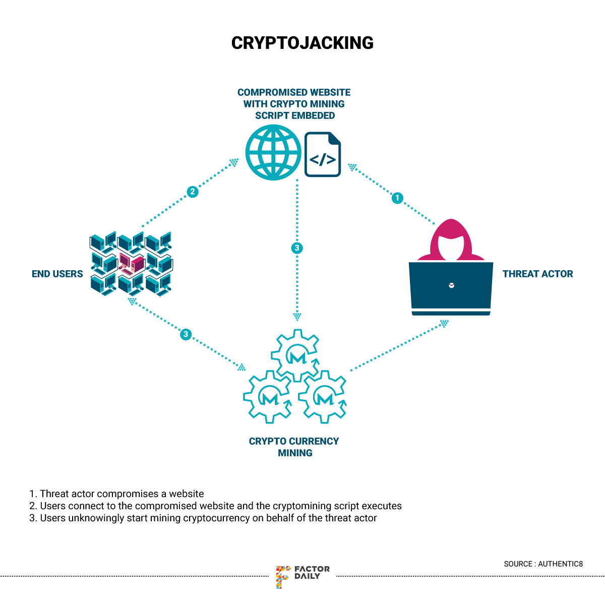 These malware attacks often hijack the host’s computers to mine for cryptocurrencies. Or they could be embedded on websites to mine cryptocurrencies using a visitor’s computer. It’s like hacking your neighbor’s wifi password to pilfer bandwidth.