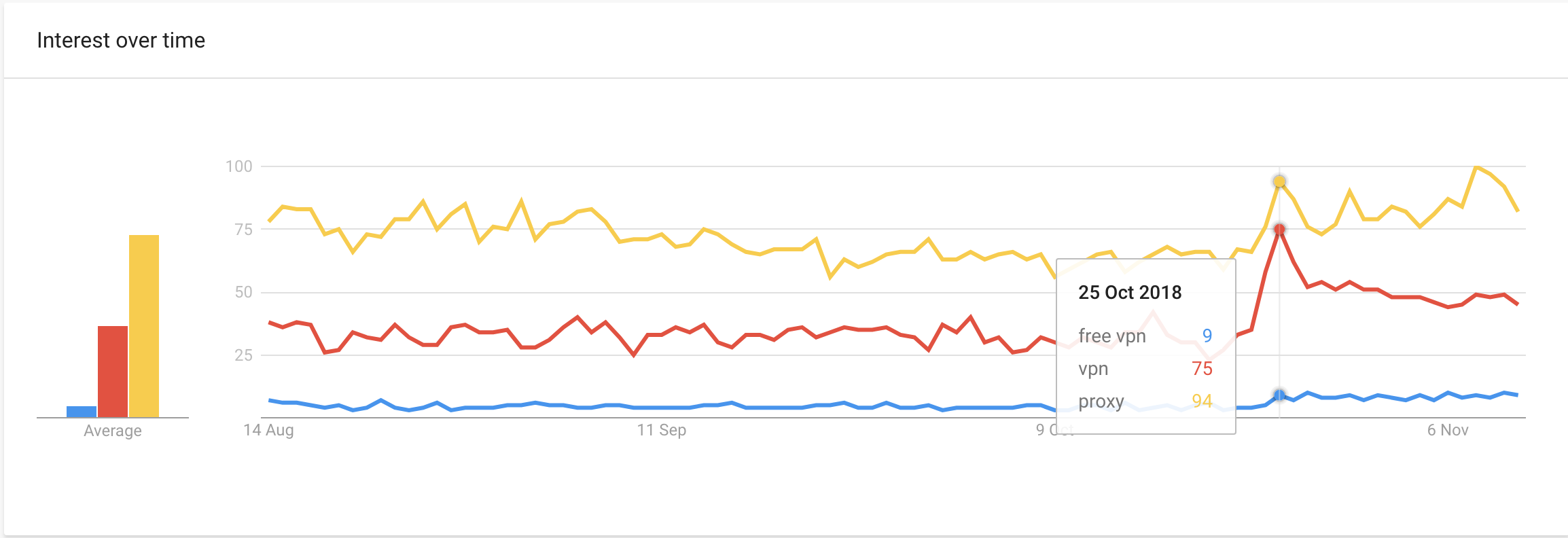 As you can see on Google Trends for India, the interest in search terms such as “VPN,” or “Free VPN” and “Proxy” started increasing sometime late October, around the same time internet service providers implemented the block.