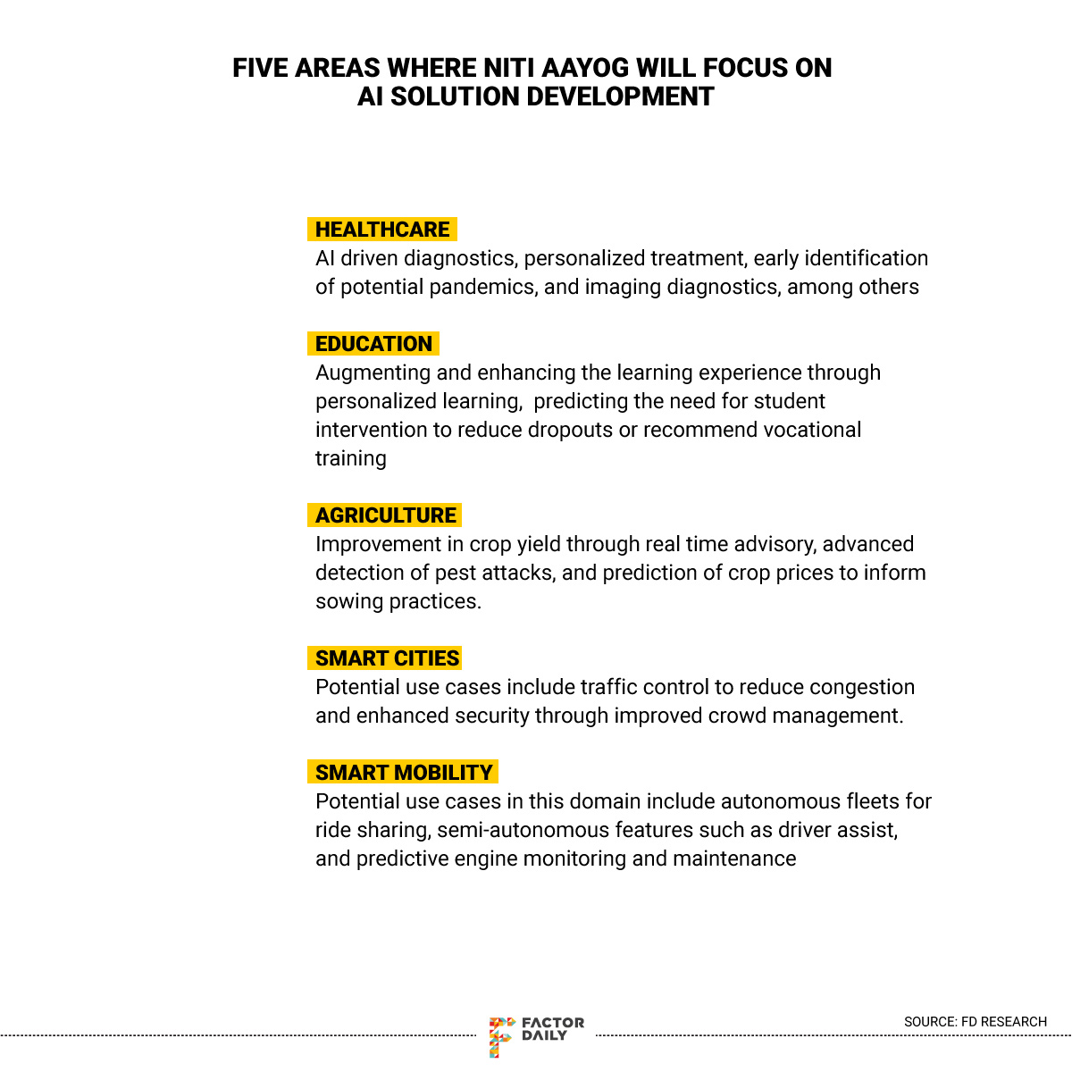 The Roy-led discussion paper is an outcome of that decision. Niti Aayog has decided to focus on building AI solutions in five areas that will potentially impact millions of lives: education, agriculture, healthcare, smart cities, and smart mobility. The government sees partnering with tech giants such as Microsoft, IBM, and Google as also a raft of startups as critical to its push.