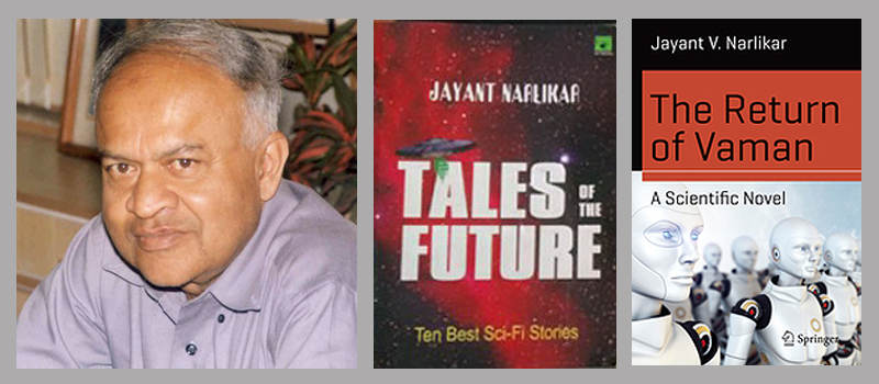 Left: Jayant Narlikar. Center: Cover of Tales of the Future that contains ten sci-fi stories written & chosen by Narlikar. Right: Cover of The Return of Vaman (Vaman Parat Na Aala in the Marathi original), one of his most popular novels.