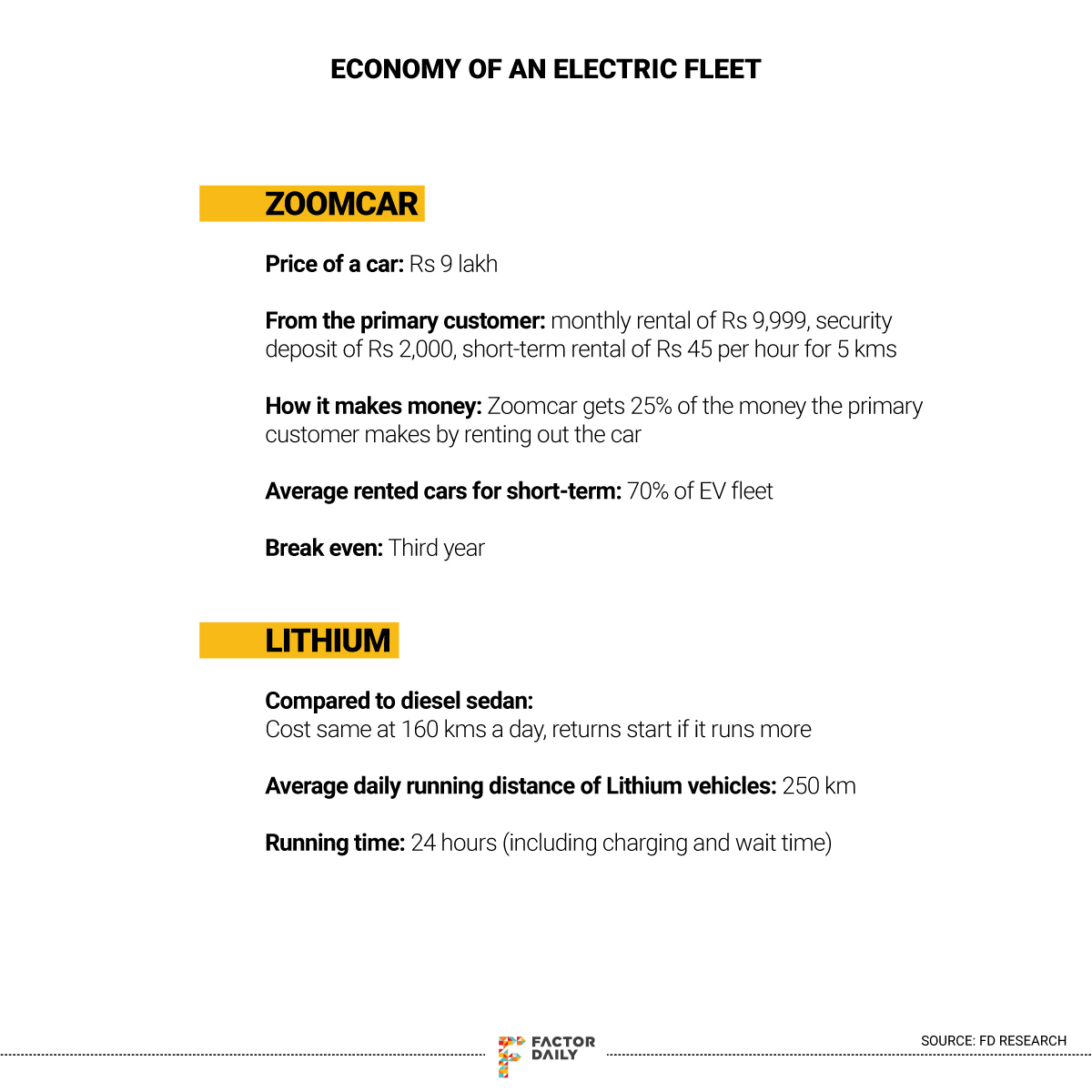 While Zoomcar focuses business-to-consumer on individuals, Lithium provides fleets only to companies. It counts Wipro, Tesco, VMware, among others in its clientele. Ola has done a pilot in Nagpur and plans to build a pan-India EV presence.