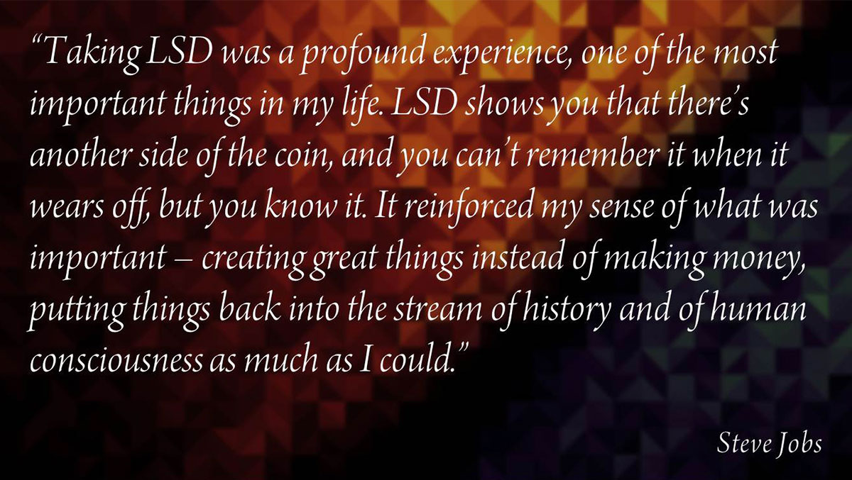 The rock stars of the modern age wore turtlenecks and hoodies, built personal computers and eclipsed even the Beatles in their fan following. For these demi-gods and those working with them, expanding the mind became a necessity and they turned to chemistry. Steve Jobs spoke in glowing terms about how LSD helped open up his mind and improve thinking.