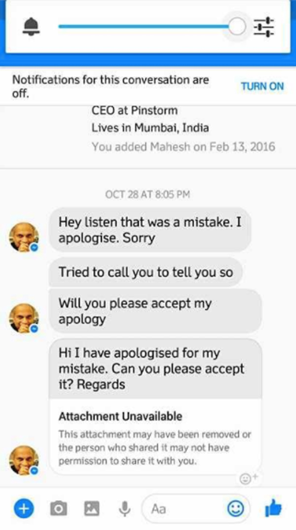 Murthy’s indiscretions with Marinelli continued into 2014. “About a year later, I went to a conference in South Mumbai, in which he was speaking in a panel. He saw me in the audience, and while the panel was going on, he started messaging me ‘Why should I pay attention to this stupid conversation when I can just stare at you?’ I jetted from the conference quickly after the panel ended so I wouldn’t have to talk to him face to face.”