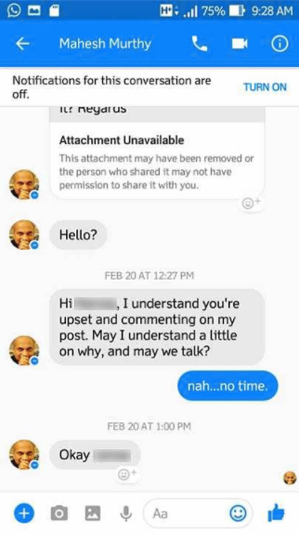 After Iyer’s post on Murthy’s messages went public this February, the officer made a comment on it on social media. Murthy again reached out to her on Messenger. “Hi (name redacted), I understand you’re upset and commenting on my post. May I understand a little on why, and may we talk?” The officer declined to do so. (See screenshots of the conversation attached with the all names blurred.)