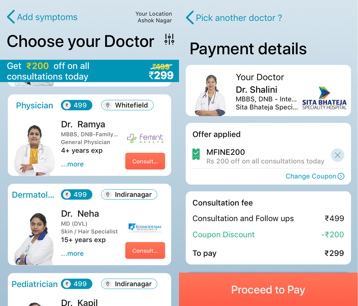 The payment for a consultation is made through the app by the patient, which is shared with the hospital, on a per-consultation basis. The startup wasn’t willing to share the terms of their revenue-share arrangement. Consultation rates start from Rs 499 and go up to Rs 700, depending on the specialty. The app is presently offering a discounted price of Rs 299 per consultation.