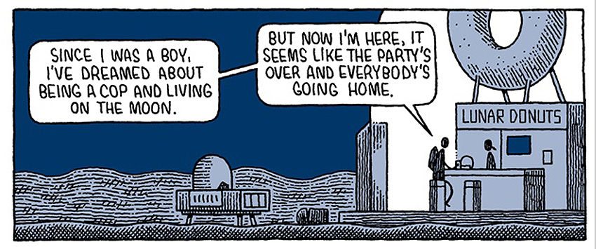 In the 2016 graphic novel, the Eisner-award nominated Mooncop, Tom Gauld brings his trademark wit, artistic style, and visual storytelling to bear in a story that depicts the life of a lunar policeman in a colony on the moon.