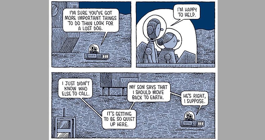 Wonderfully sparse and subtle in its details, in Gauld’s minimalist style (sparing dialogue, and stark landscapes) Mooncop is melancholic and hopeful at the same time. It’s almost poetic with a lot left unsaid, and, to your imagination. It’s a commentary on humans as social animals and the small existential ironies of our life, of scientific progress, space colonisation, as it is about friendship and new beginnings. The R2D2-style robots, spacecraft, living quarters and space modules are a lovely visual return to their depictions in classic sci-fi movies. There’s fun and wonder, and moments that alternatively make you smile and think (and many times, both at the same time), but it’s also tinged with a sense of being bittersweet that lingers in your mind, long after you’ve turned the last page. Speaking of which, and for all this, Mooncop clocks in at just under 100 pages (94 to be exact).