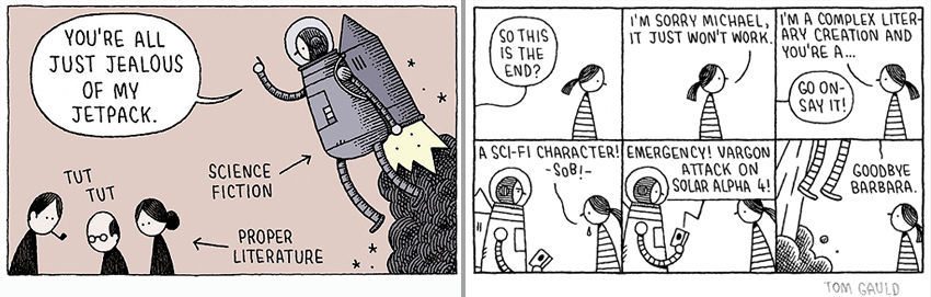 If there’s one thing I must be thankful to The Guardian for, it’s for introducing me to two of the finest and funniest cartoonists currently active, David Squires and Tom Gauld. While David Squires and his fiendishly clever, and caustic cartoons about the game of football (the one actually played with only the foot) are a tad outside the purview of a sci-fi column, Tom Gauld is not.