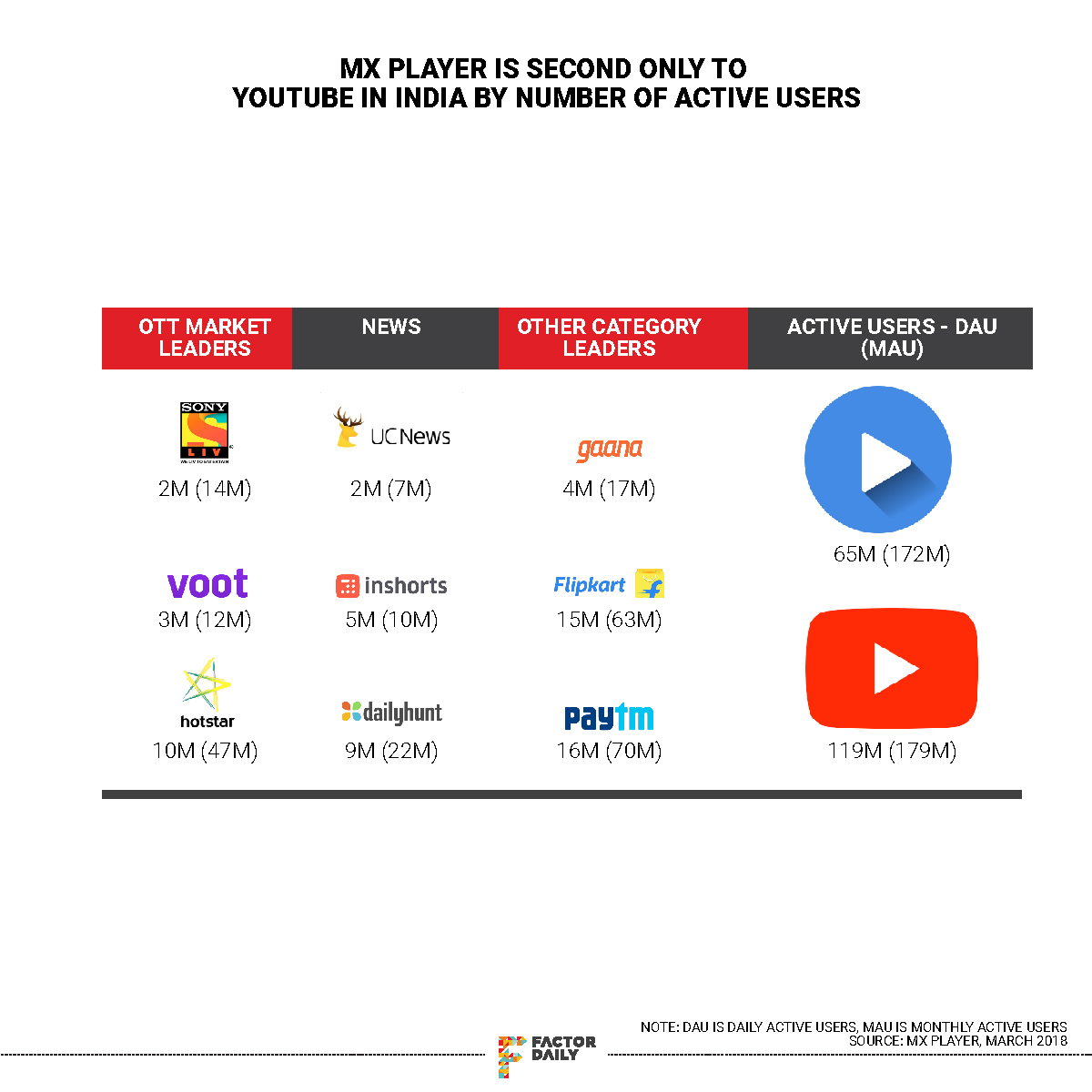 At the end of March, as per one estimate, MX Player had 172 million monthly active users and 65 million daily active users in India. That’s second only to Youtube which has about 180 million monthly actives and 120 million daily actives in India. It also makes MX Player much larger by numbers than current market leaders like Hotstar, Voot and SonyLiv.