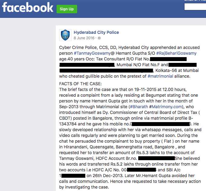 Updated at 10:13 am on April 25, 2018 to replace the image of the Facebook page of the Hyderabad police. The earlier image had some phone numbers and bank account numbers, which have been redacted now in the new image.