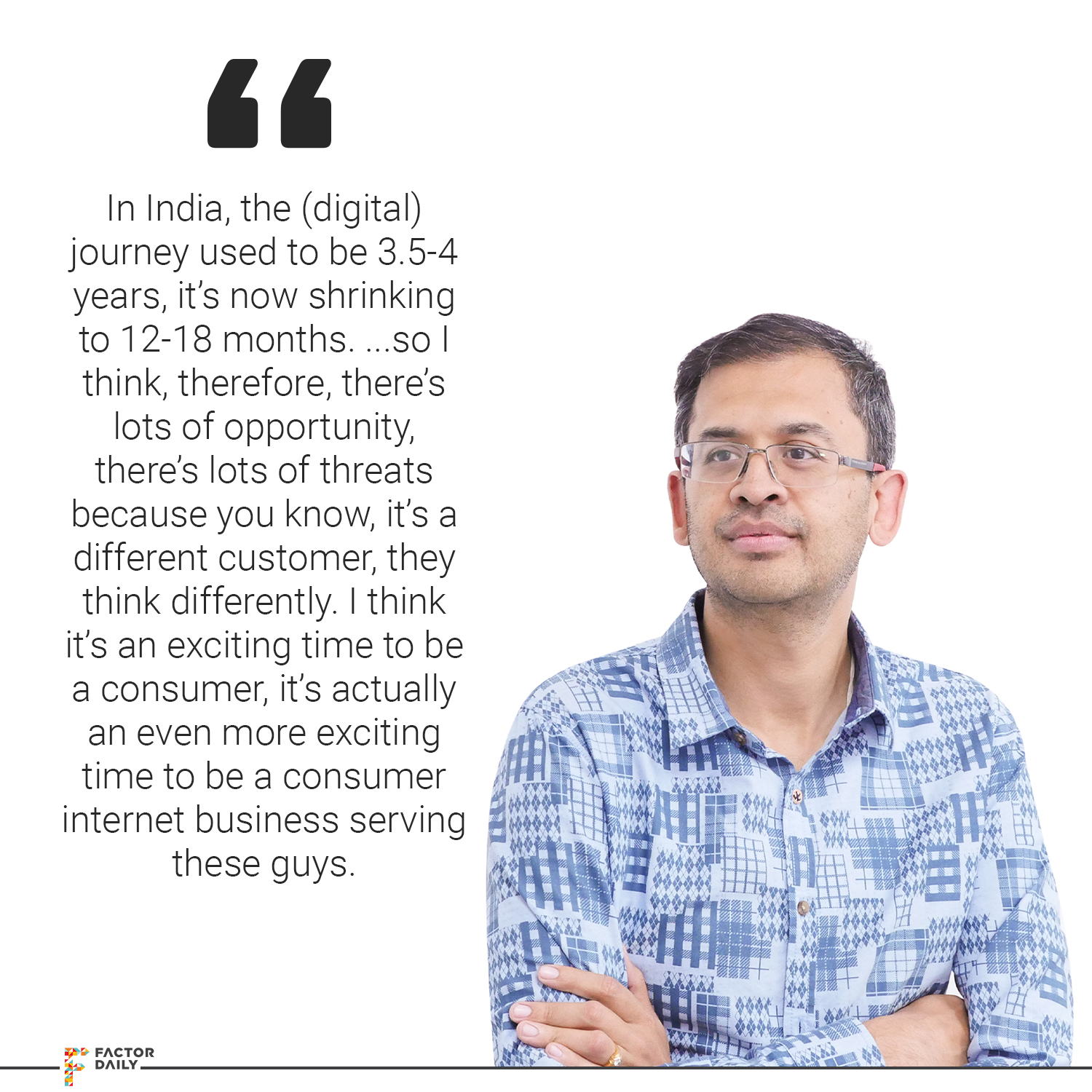 Then, slightly before buying products is your apps like Uber, Ola, all of that. So that’s the digital journey that a typical consumer goes through. In India, the journey used to be 3.5-4 years, it’s now shrinking to 12-18 months. So the adoption of technology in the consumer journey is actually going up. That time frame is now shrinking to 12-18 months, so I think, therefore, there’s lots of opportunity, there’s lots of threats because you know, it’s a different customer, they think differently. I think it’s an exciting time to be a consumer, it’s actually an even more exciting time to be a consumer internet business serving these guys.