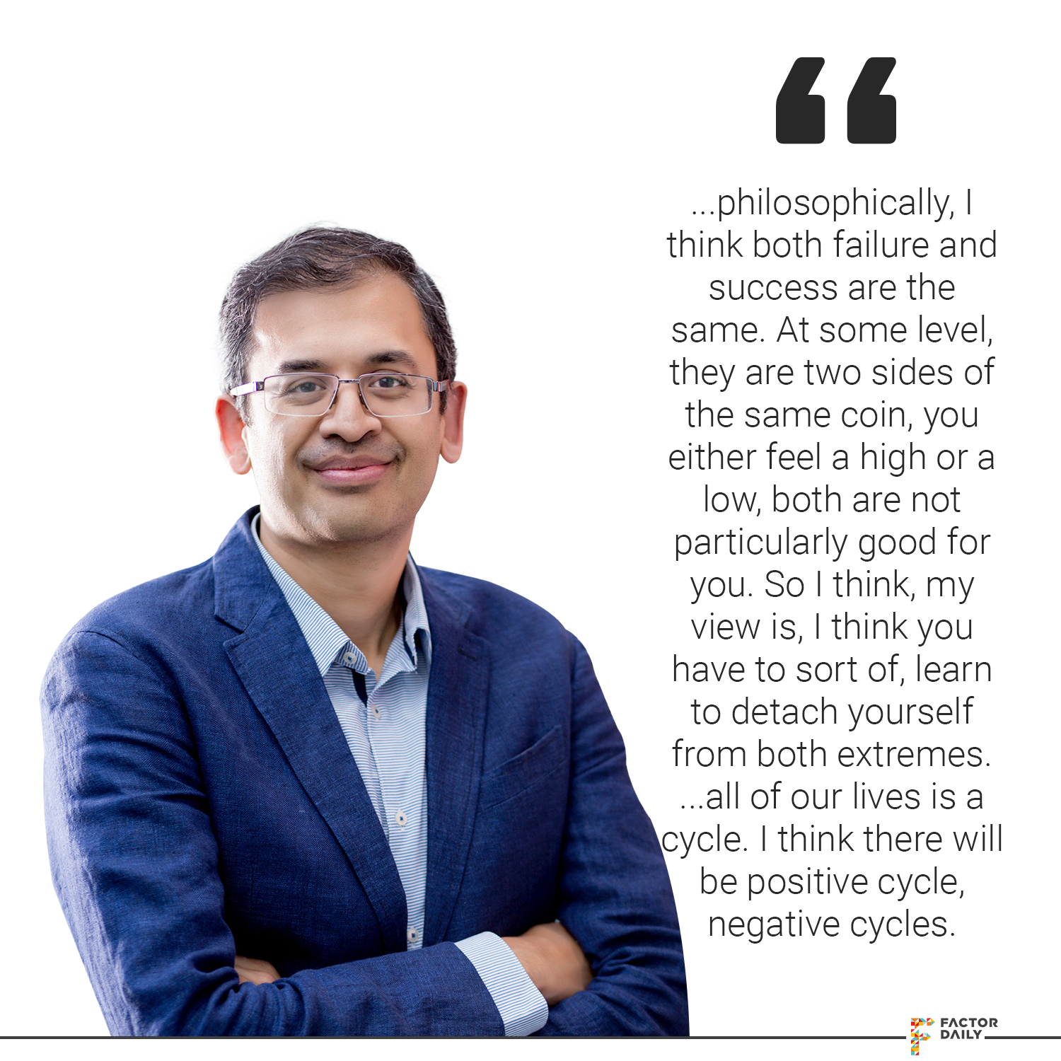 Ananth: So, I think, many things. First philosophically, I think both failure and success are the same. At some level, they are two sides of the same coin, you either feel a high or a low, both are not particularly good for you. So I think, my view is, I think you have to sort of, learn to detach yourself from both extremes. Hard to do, meditation helps, I think having a family and friends helps… But I think it’s really important because I think, all of our lives is a cycle. I think there will be positive cycle, negative cycles.