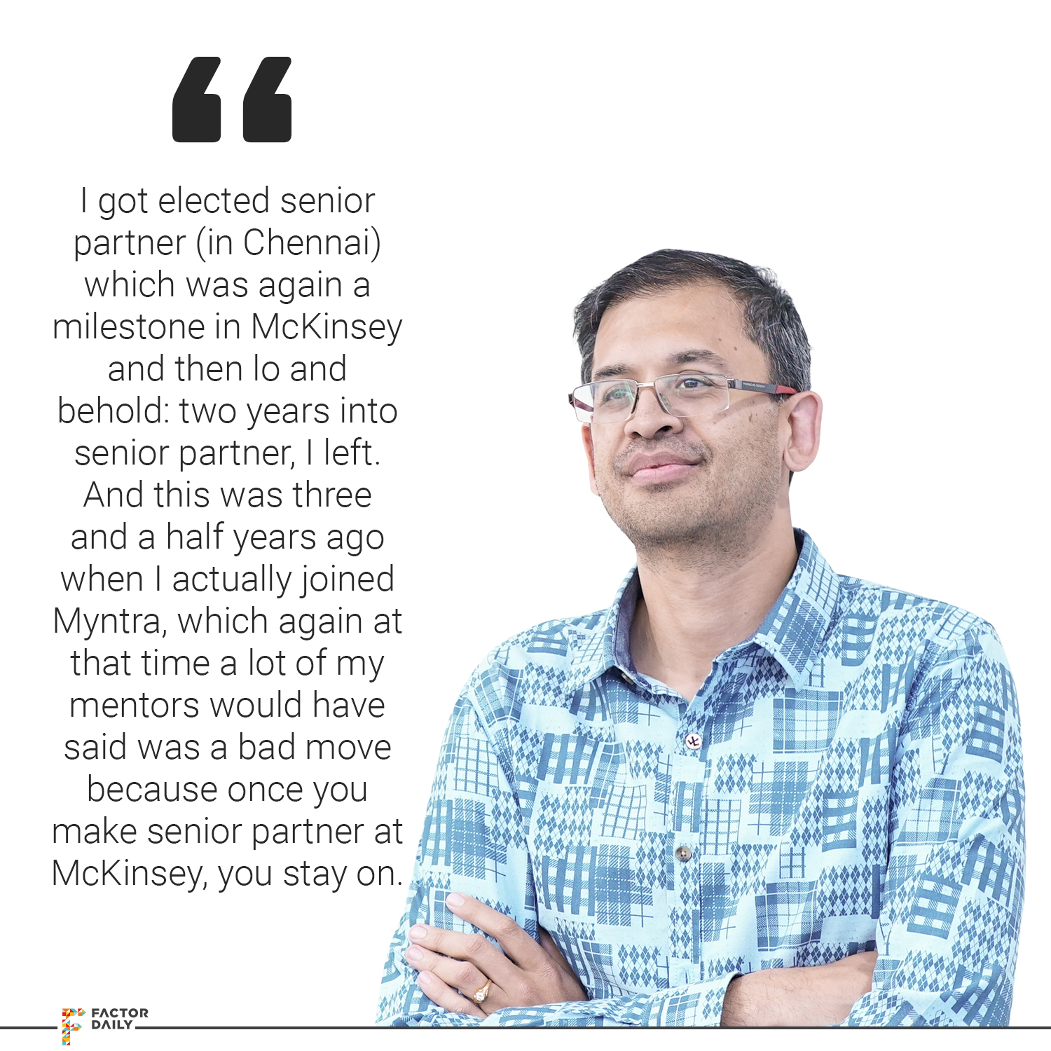 I got elected senior partner there which was again a milestone in McKinsey and then lo and behold: two years into senior partner, I left. And this was three and a half years ago when I actually joined Myntra, which again at that time a lot of my mentors would have said was a bad move because one you make senior partner at McKinsey, you stay on.