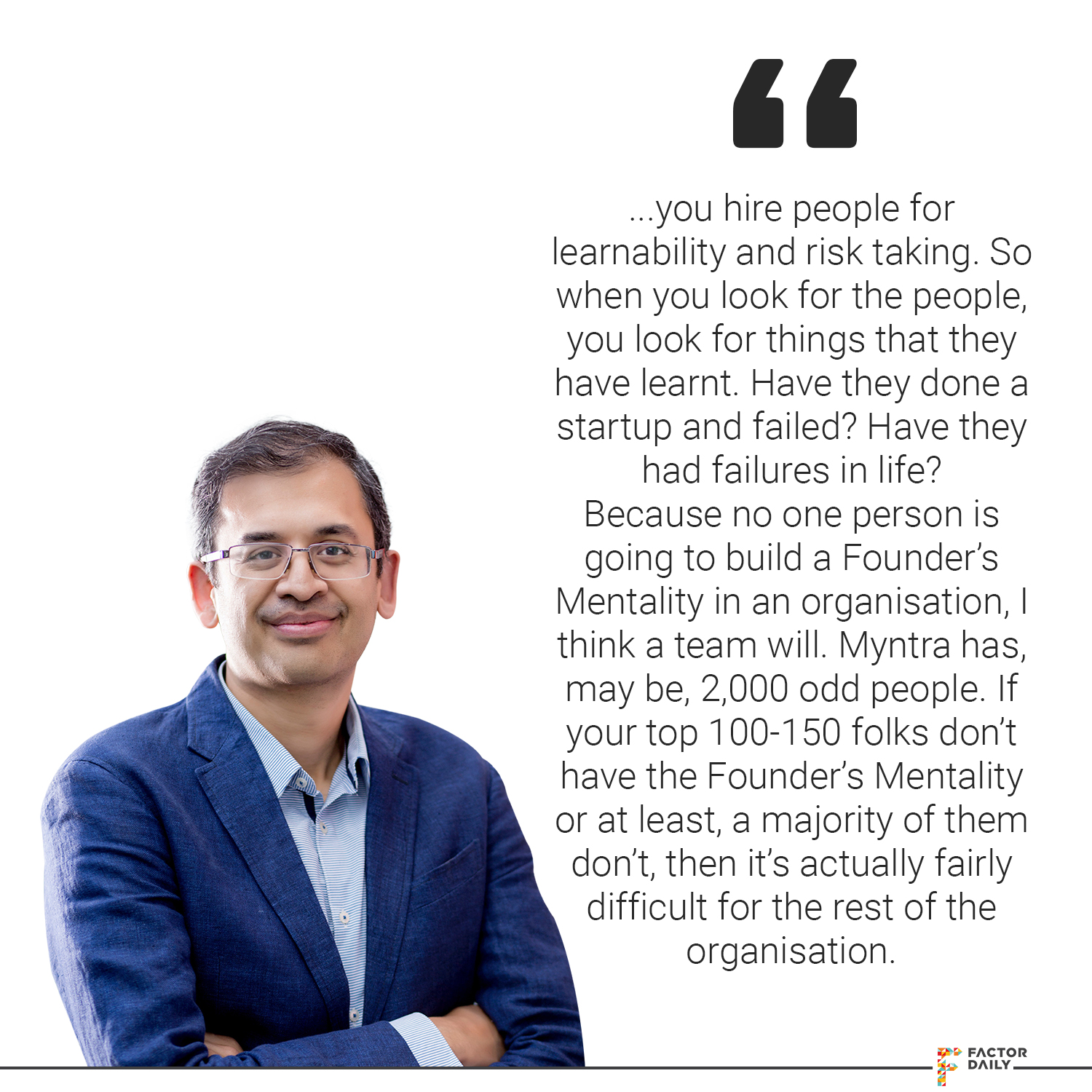 Myntra has, may be, 2,000 odd people. If your top 100-150 folks don’t have the Founder’s Mentality or at least, a majority of them don’t, then it’s actually fairly difficult for the rest of the organisation. So that’s number 3.